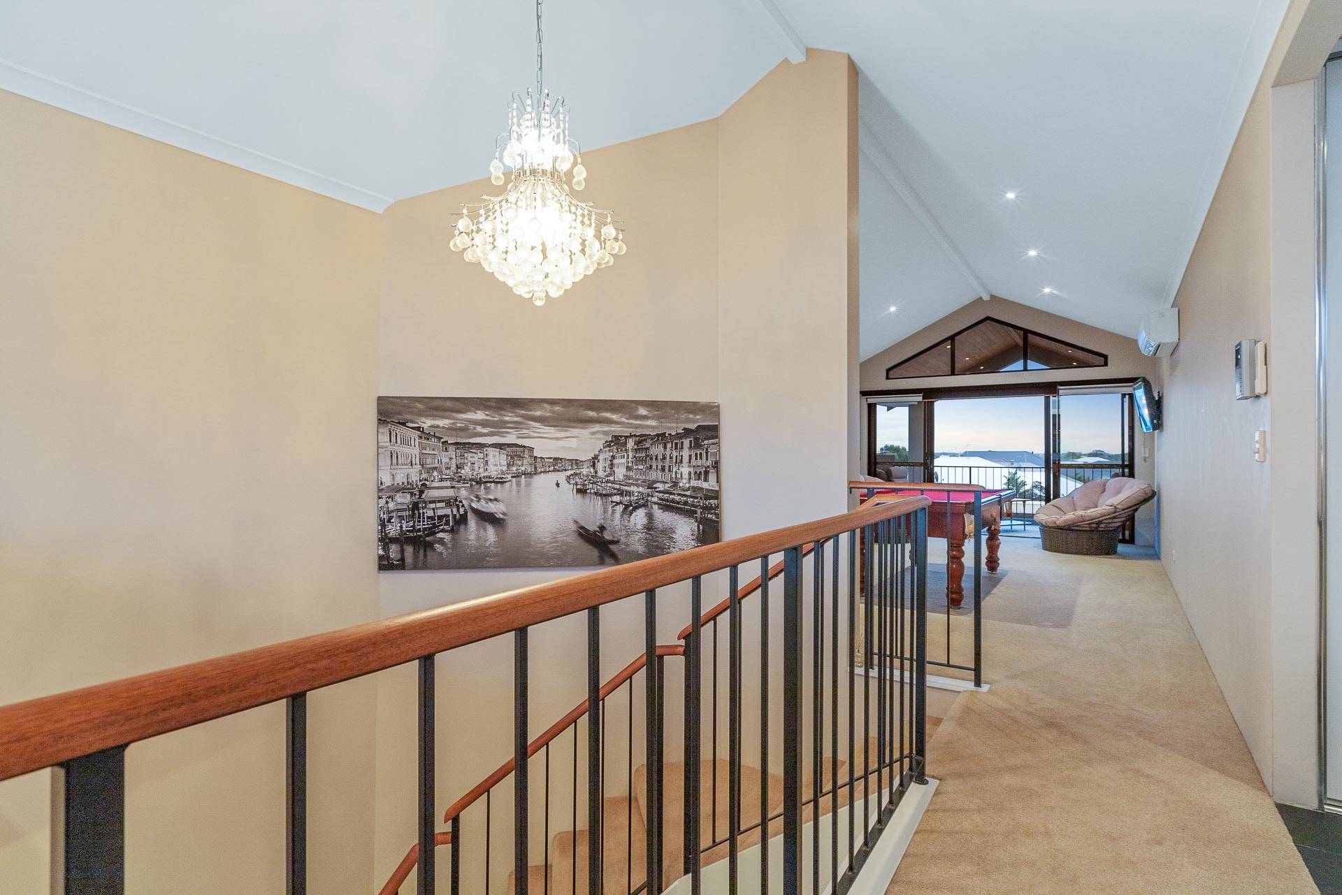Cathedral ceilings on the lower and upper levels open the freshness, space and light right throughout the property .