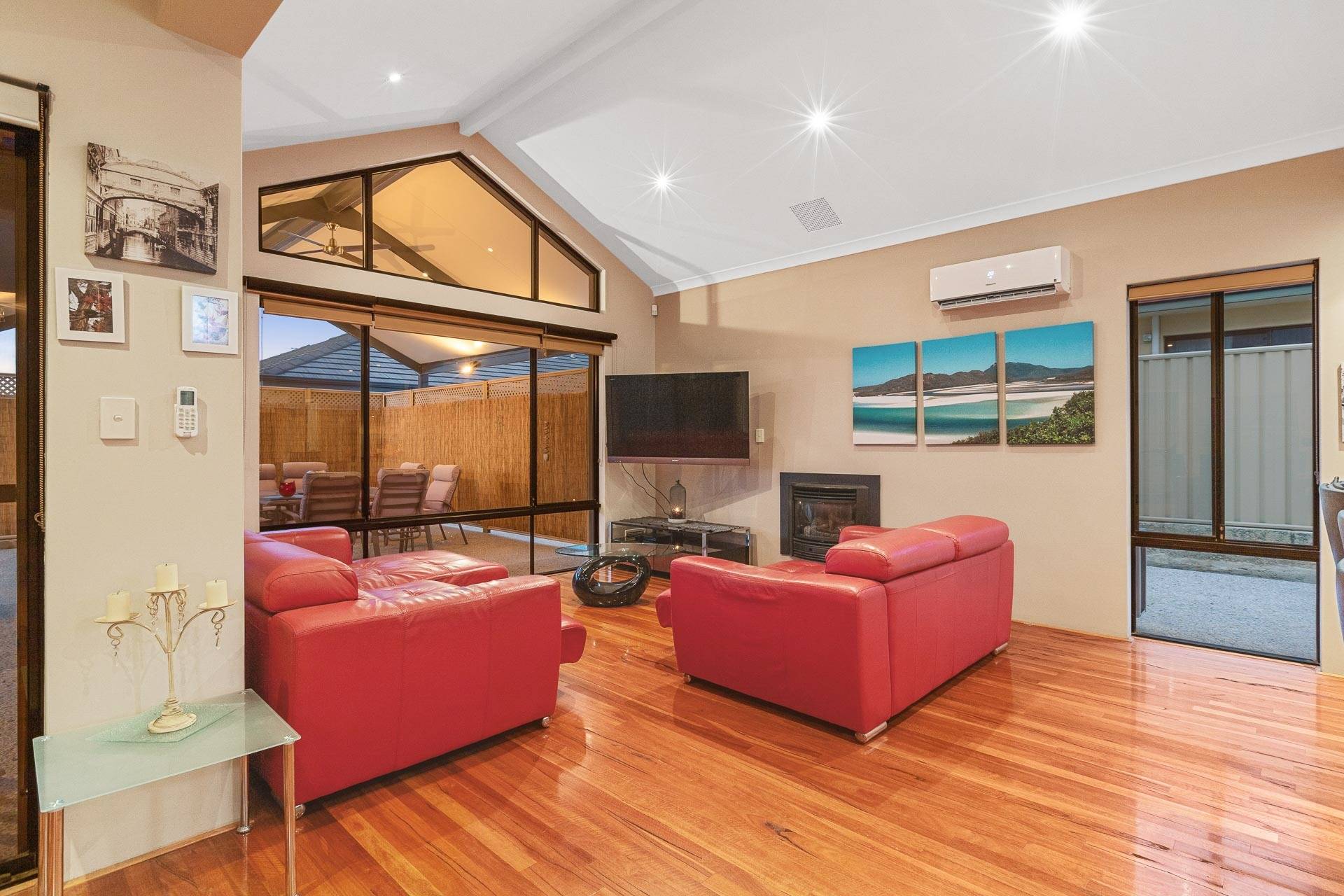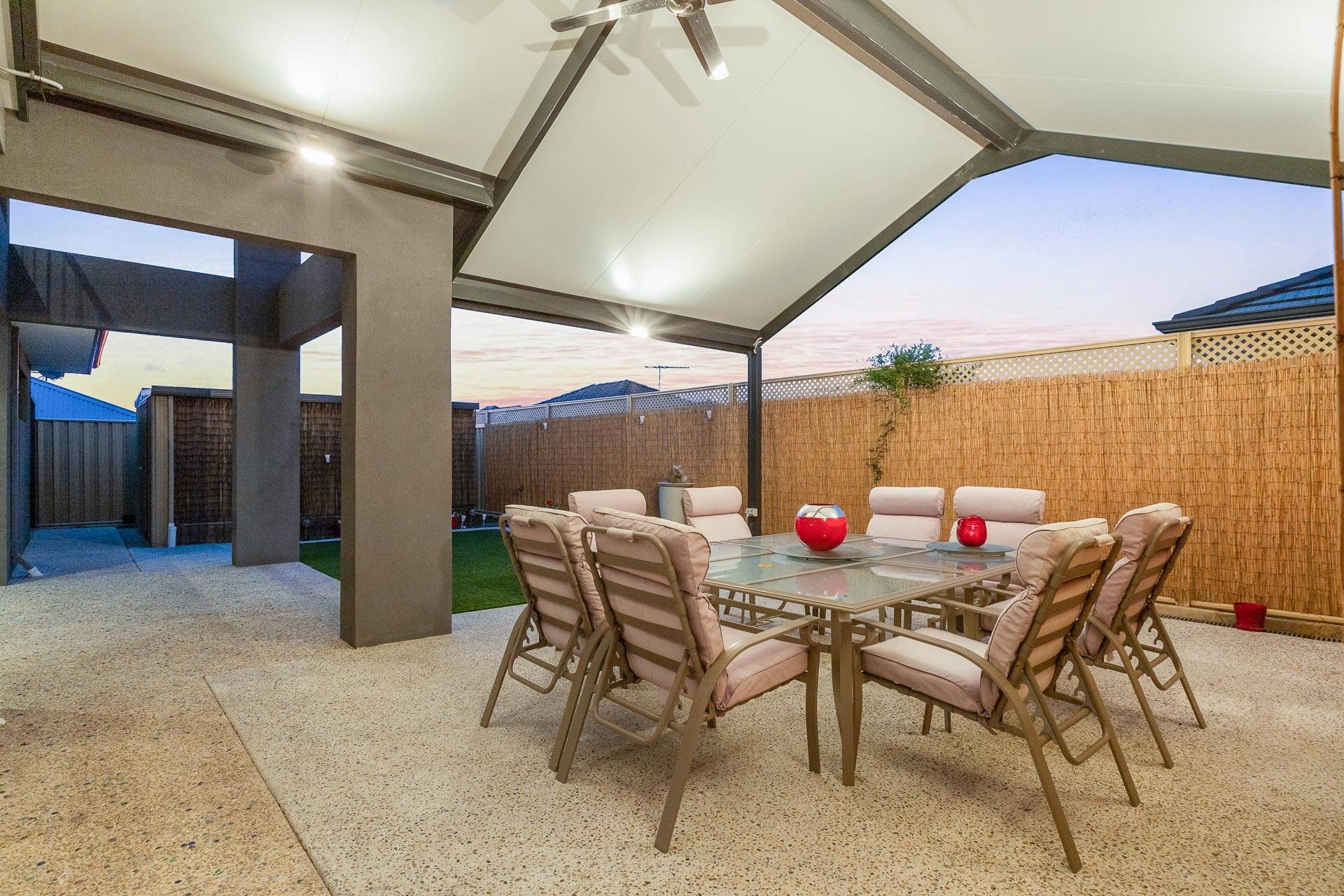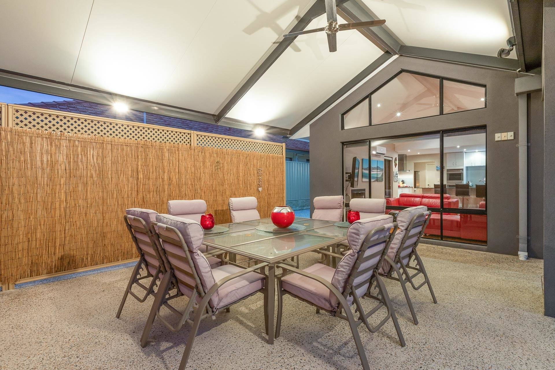 Perfect for all year round entertaining the gabled outside alfresco area has a ceiling fan and roll down blinds suitable for any occasion.