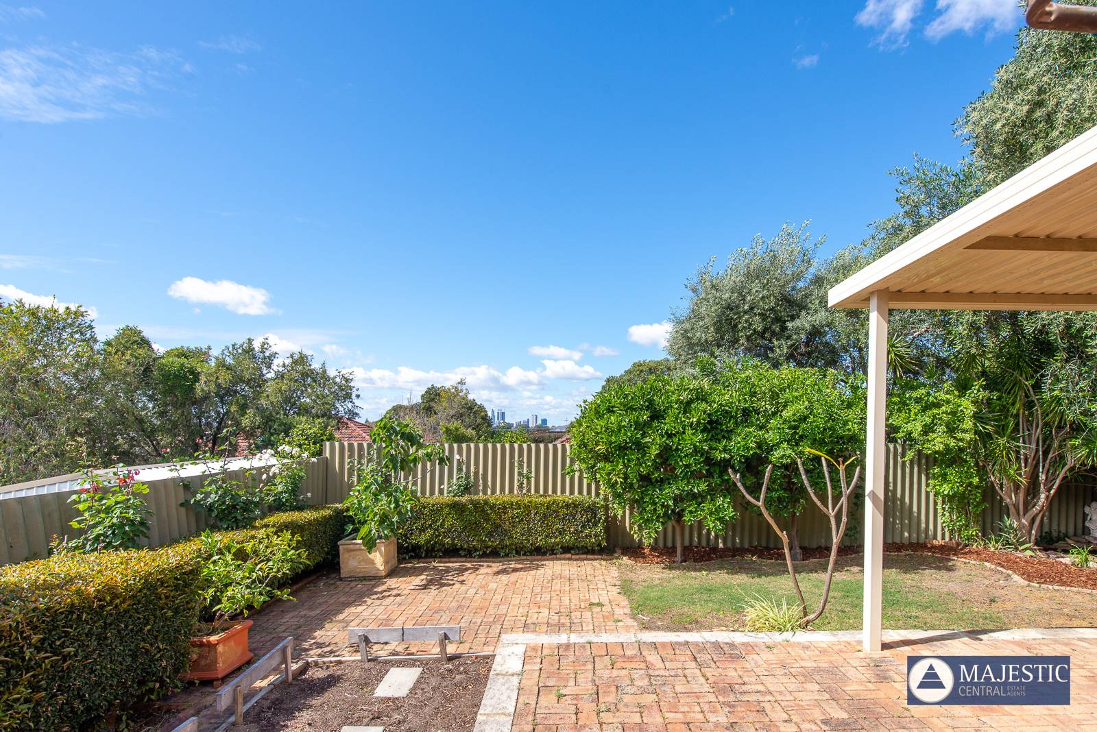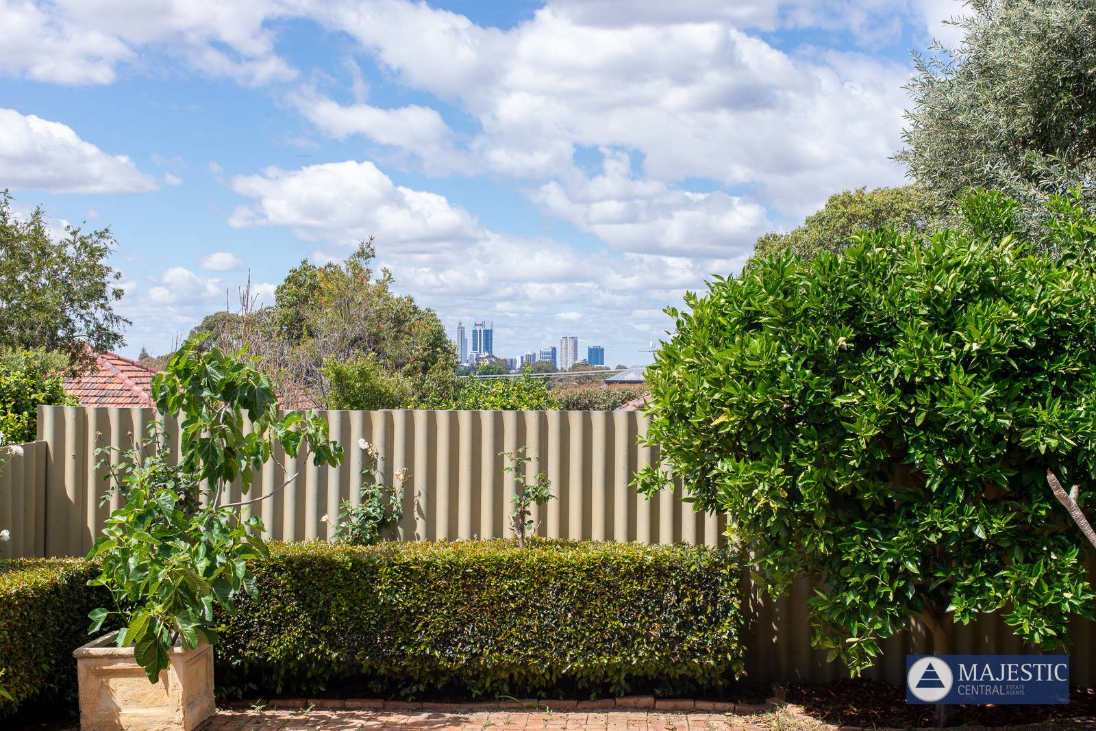 This quiet corner townhouse, tucked away in a well-maintained complex of eight, has a gorgeous private garden complete with roses, fruit trees and a fish pond, and with sweeping views across to the city from upstairs. Sitting in the leafy garden, you can only hear birds, yet Flinders Street is just 200 meters away. The home is light, bright and airy and has an inviting, homely feel. It features blackbutt timber floors downstairs and two generous bedrooms upstairs, with a smaller third bedroom/study.