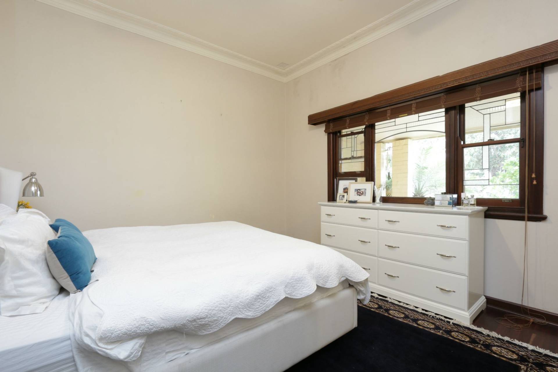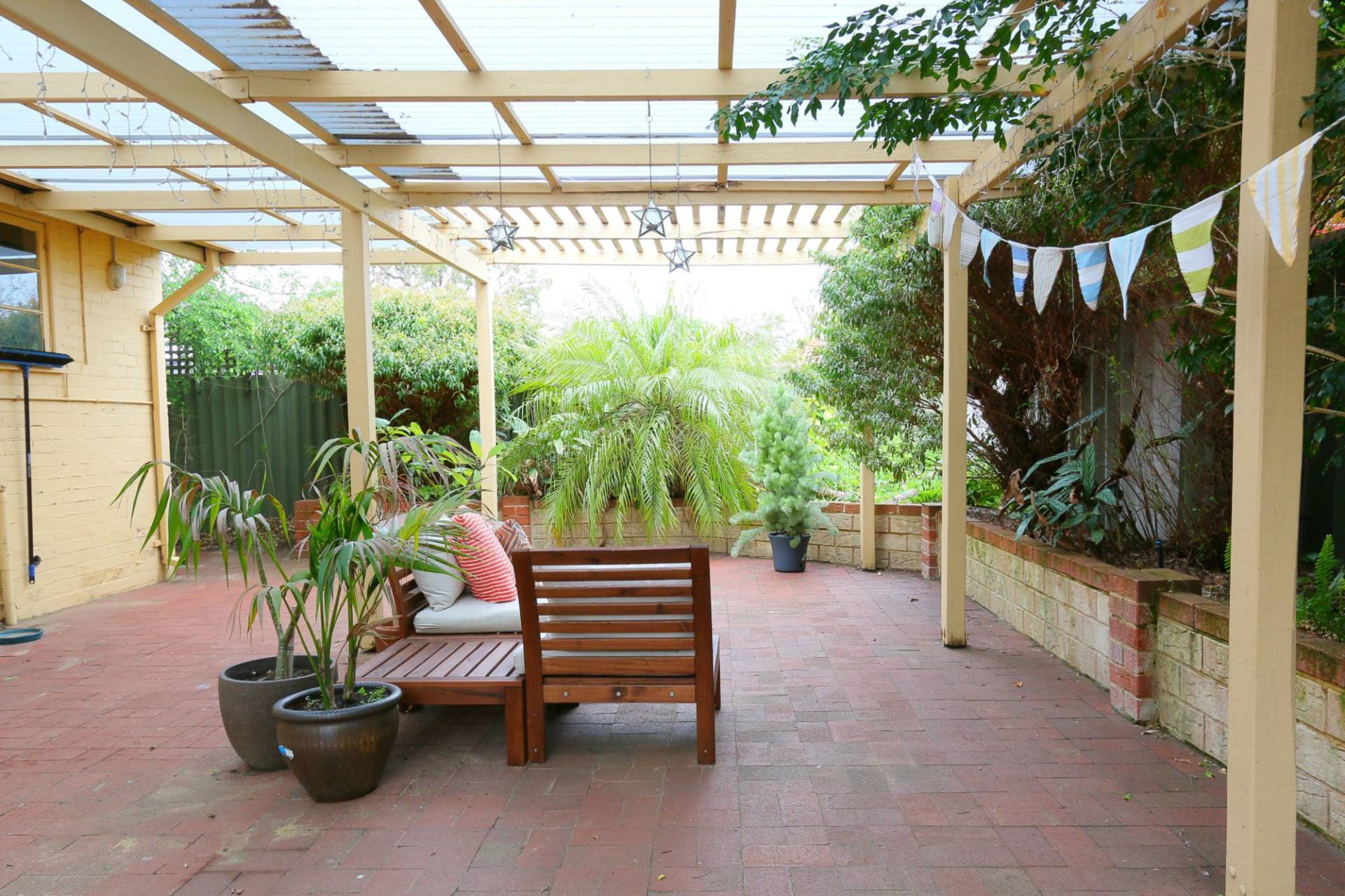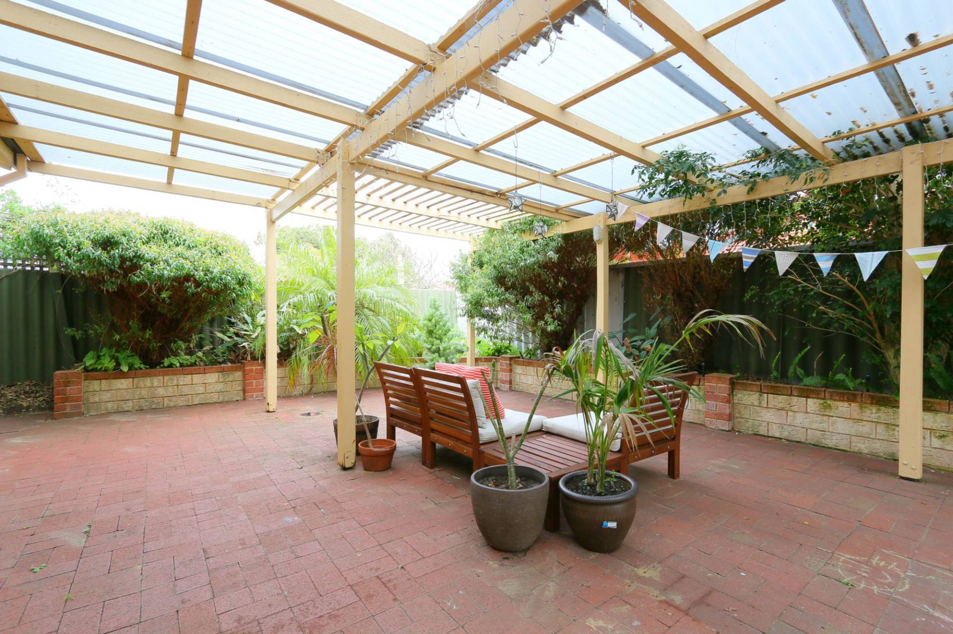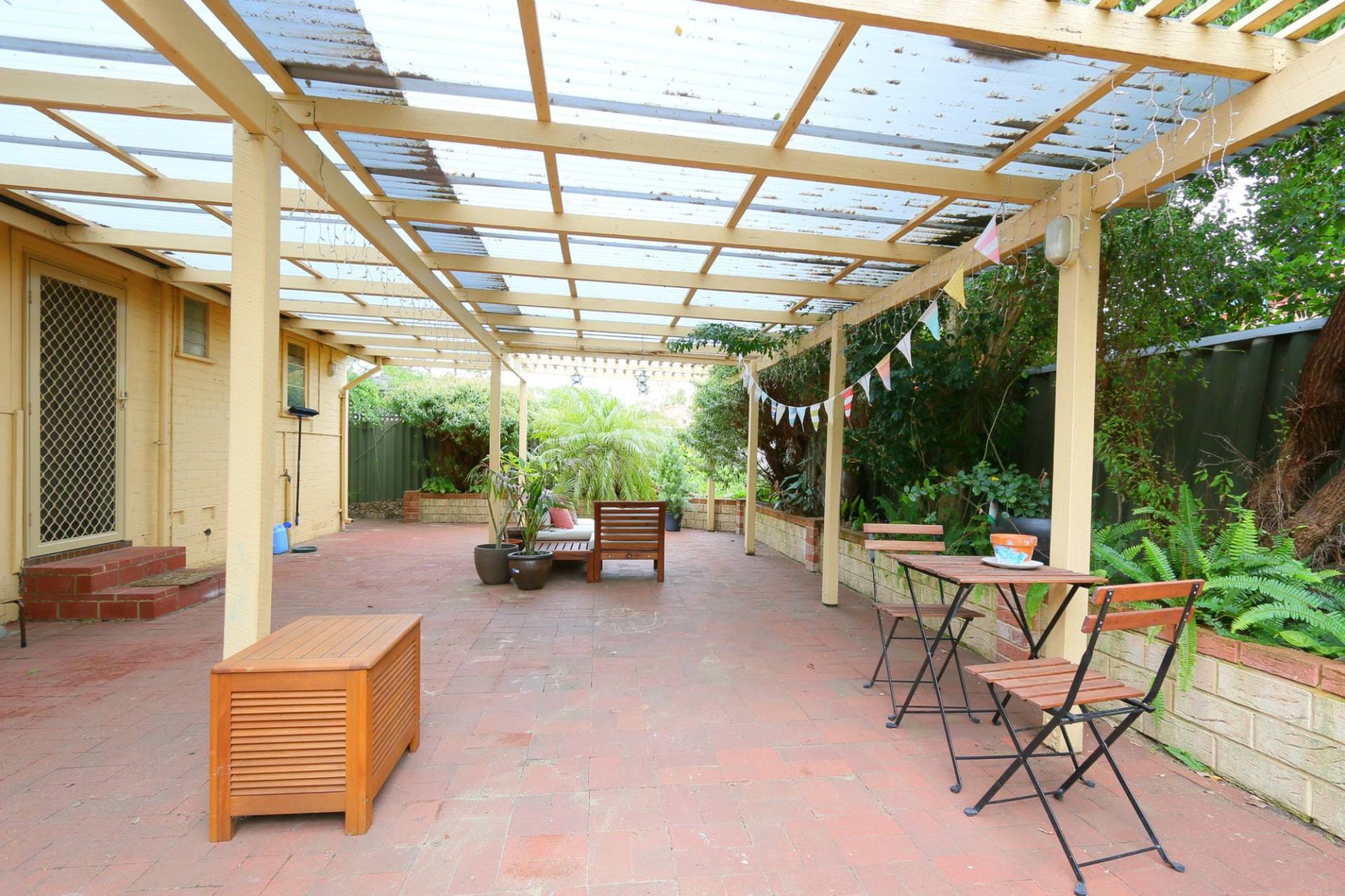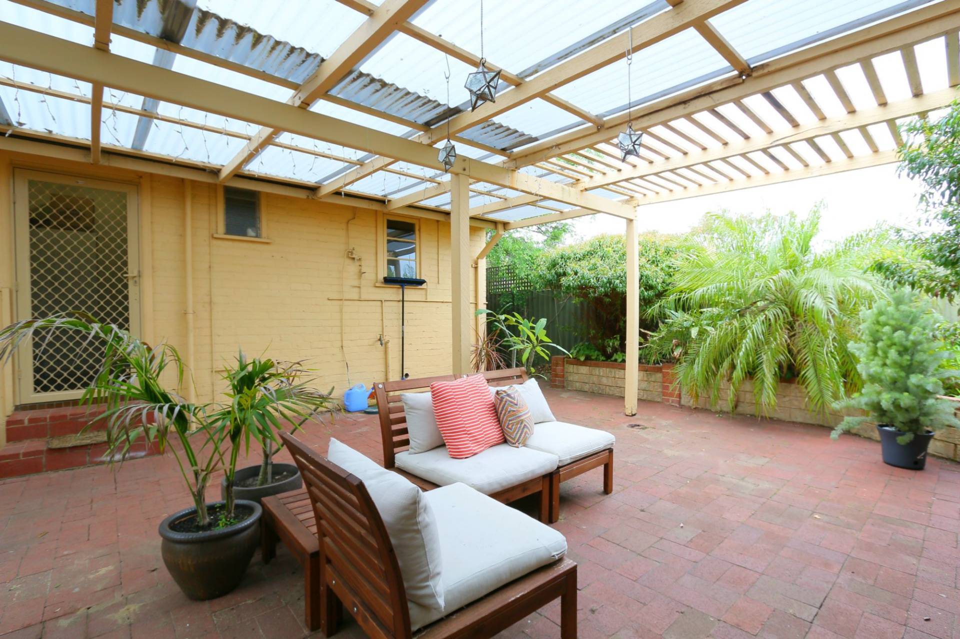 3 bedrooms, wide hall, separate living room with gas heating, extra high ceilings, floorboards, spacious kitchen with ample cupboards, bathroom with bath tub, air-conditioning, alarm system, backyard with extensive alfresco area and single garage.