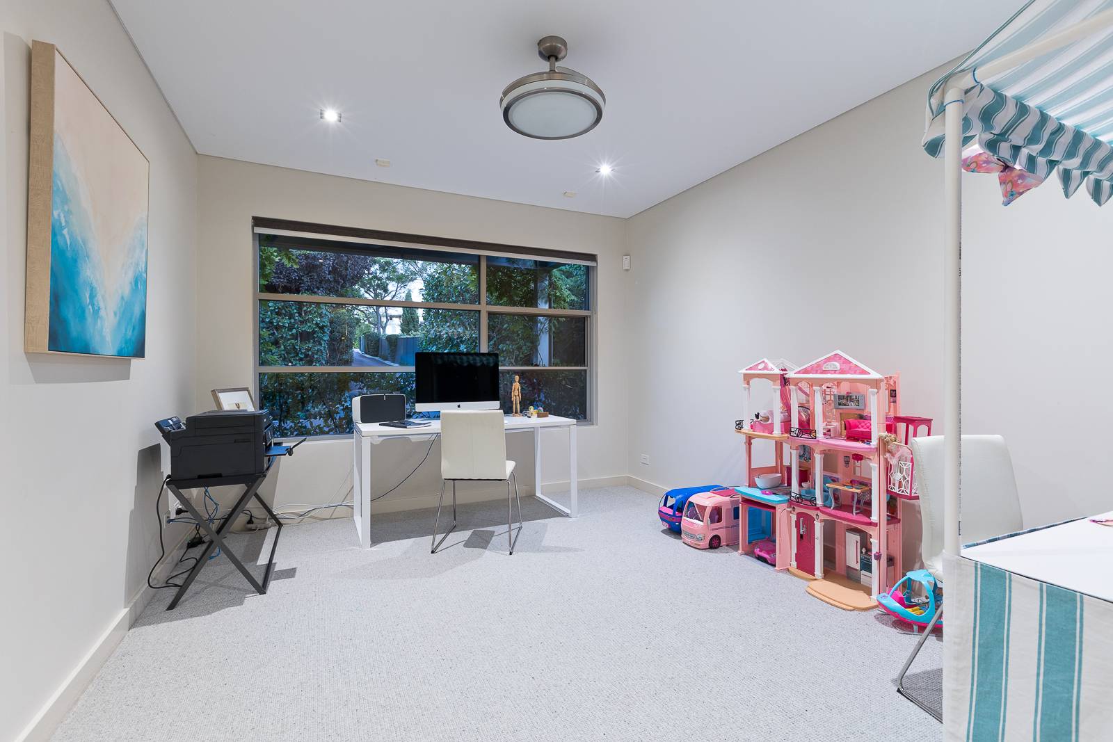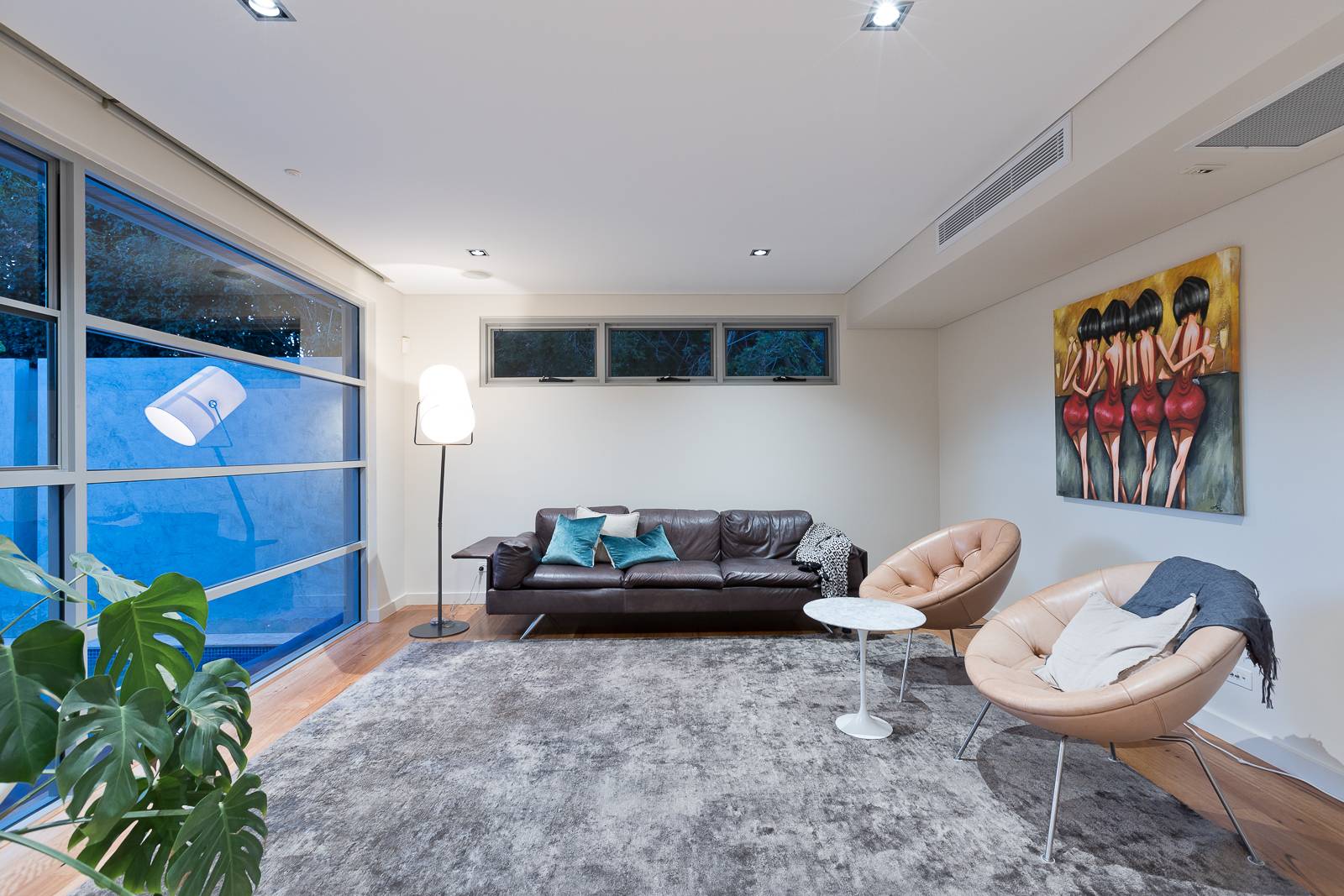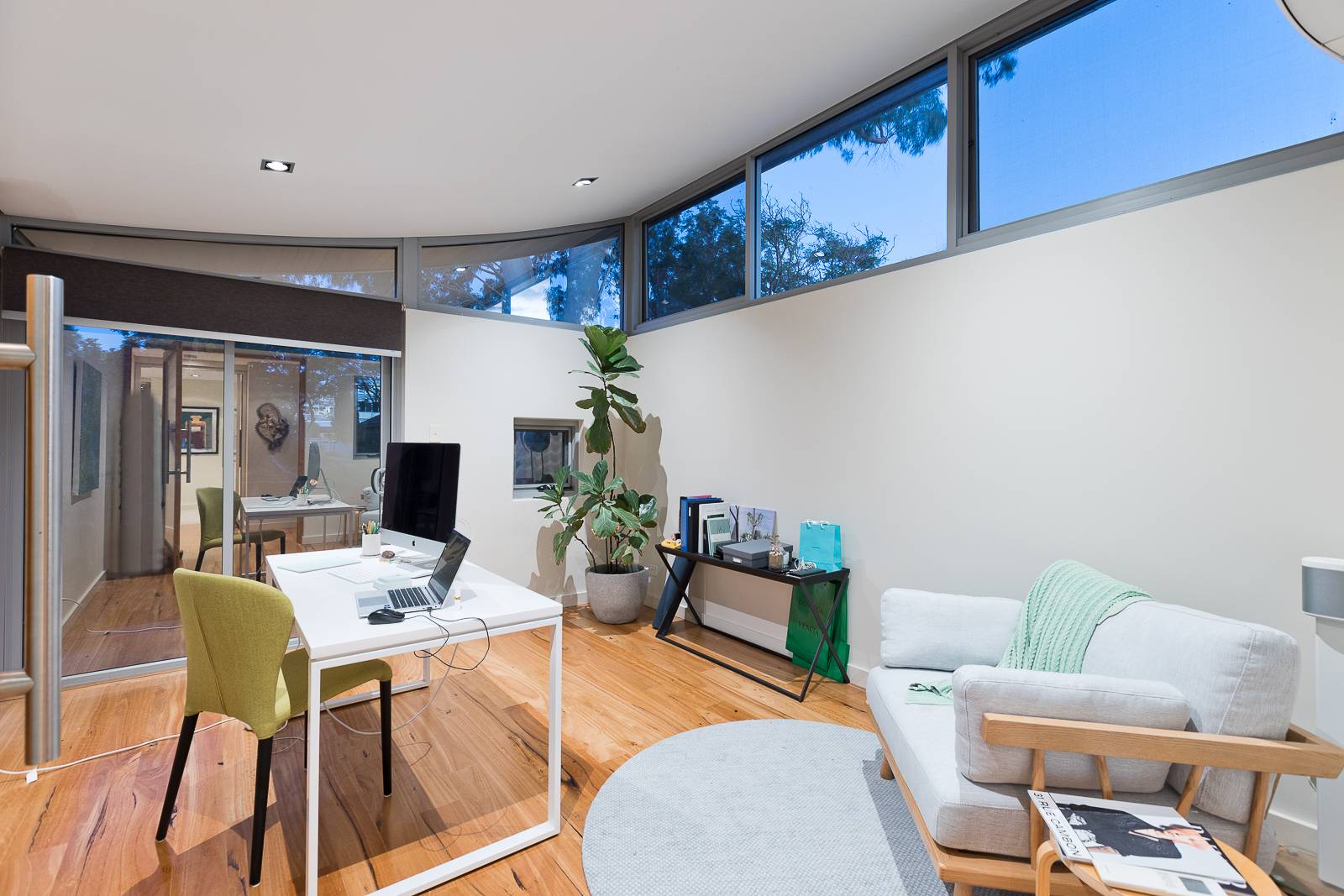 - Light-filled gym/ lounge room with warm timber floors