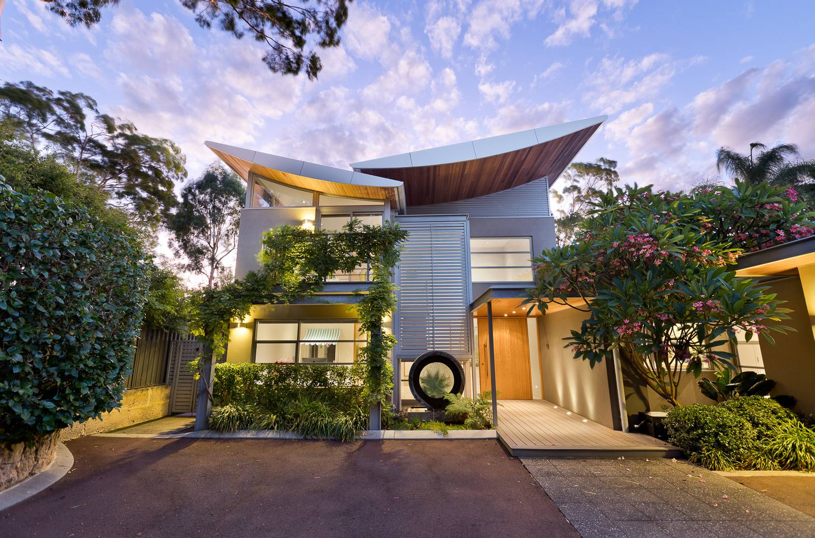 - Timber-lined roofline and eaves with sweeping curves