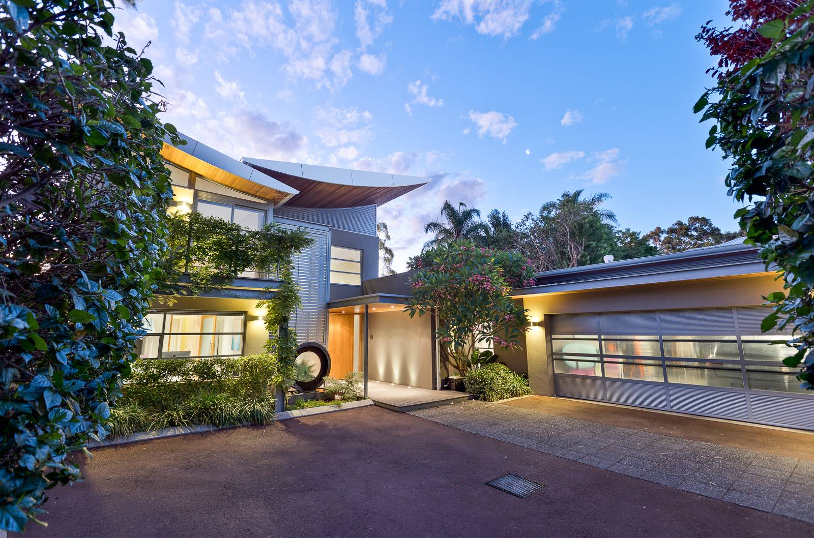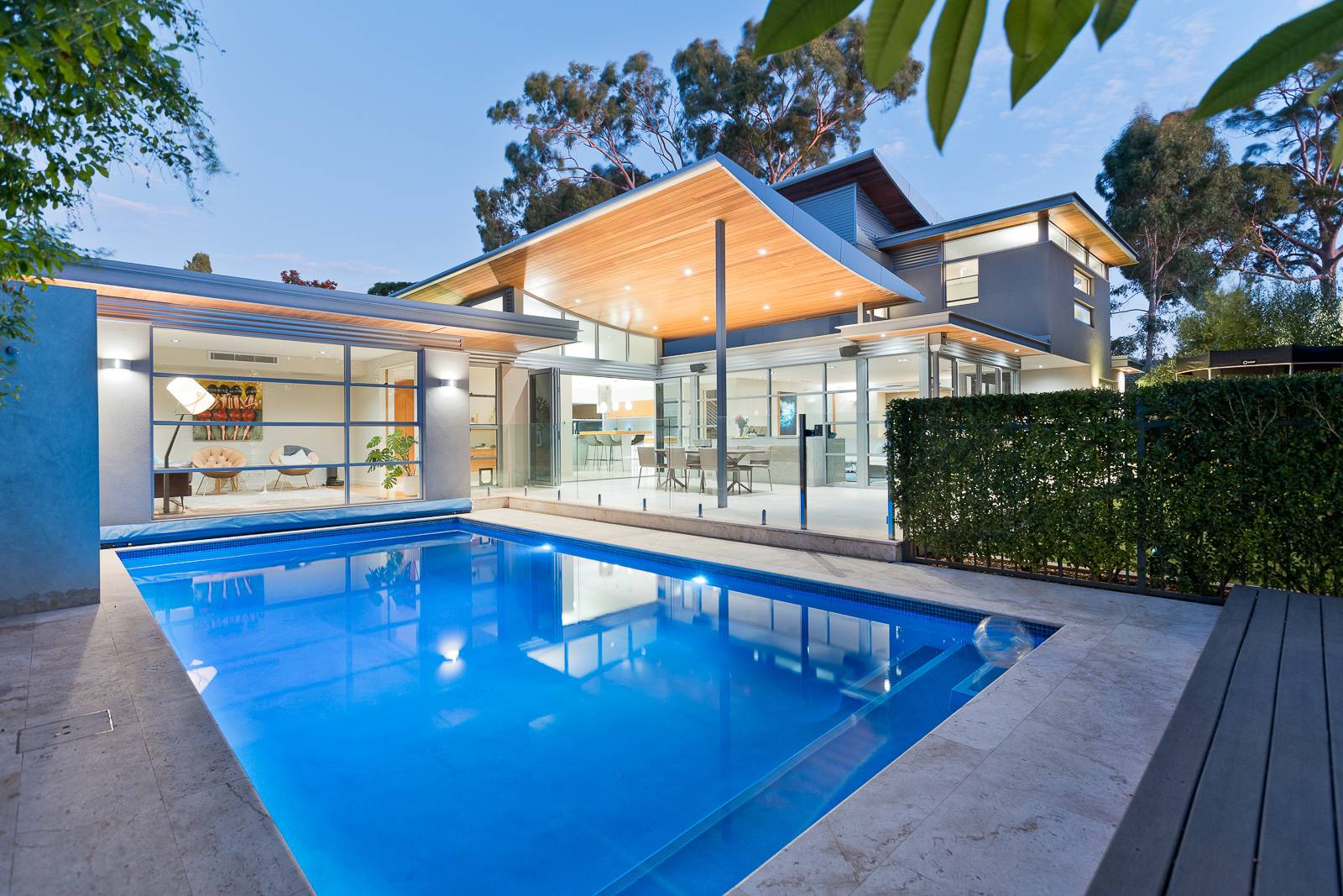 - Balanced use of natural timbers and stone with architectural raw concrete and glass